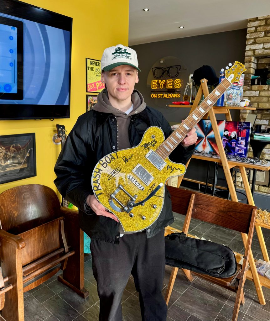 Gifted to the shop by Oakley Moffat drummer of a St Albans rock band Trashboat, when Jez saw this sparkling yellow Aria Pro II M-Series he had to have this for the decor, thanks to all Trashboat for the signatures…
